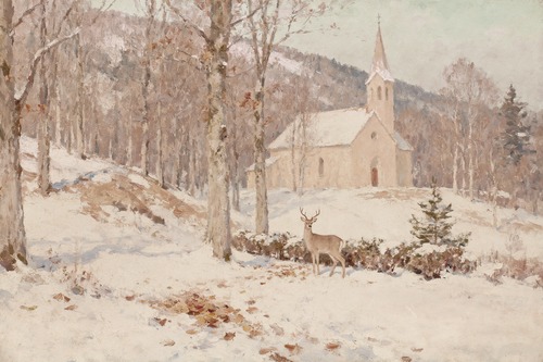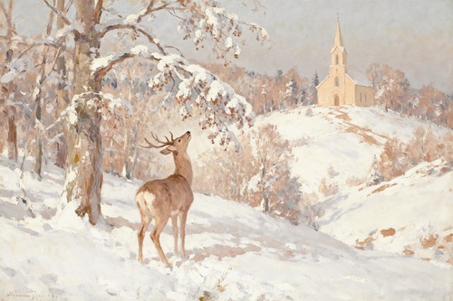 Framed Deer by Mountain Church Peaceful Winter Landscape Illustration Living Room Bedroom Office NATURAL