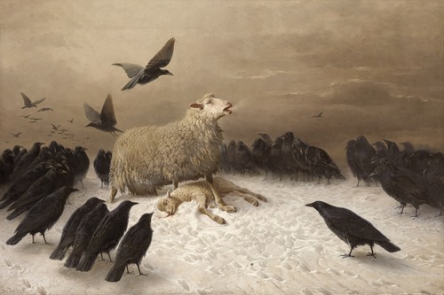 MUDECOR Framed Distressed Sheep Surrounded by Crows Dramatic Winter Illustrations Fine Decorative Zen Multicolor CountryFarmhouse Retro Bedroom Natural