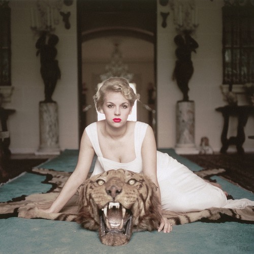 Framed Retro Glamour Portrait Woman in White Dress with Tiger Rug in Luxurious Illustrations RelaxCalm Warm Living Room Bedroom Office Black