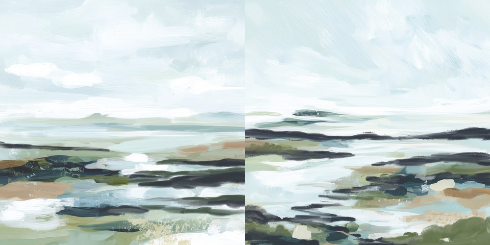 Framed Set Coastal Horizon Abstract Ocean and Shoreline Painting in Blue and Green Illustrations Calm Living Room Bedroom Office White