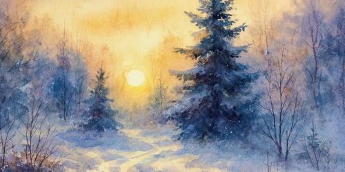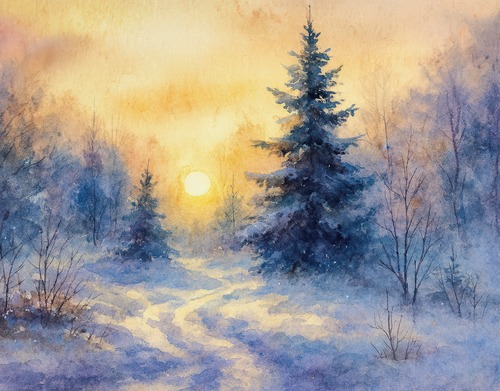 Extra Large Framed Winter Sunrise in Snowy Pine est Watercolor Home Living Room Bedroom Decor (Frame Assembly Required)