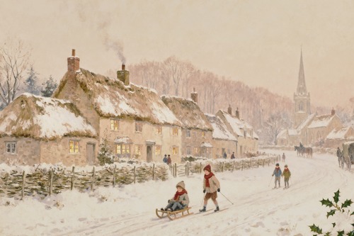 Snowy Village Street with Church and Deer Vintage Winter Illustrations Scenic Colorful Multicolor Warm Living Room Bedroom Office