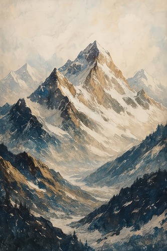 Snowy Mountain est Tranquil Neutral Winter Landscape Illustrations Scenic Colorful Multicolor Warm Living Room Bedroom Office