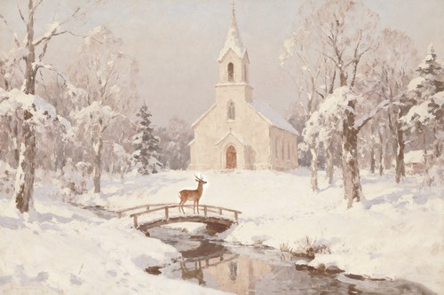 Framed Winter Church Landscape Snowy with Deer and Chapel Illustration Living Room Bedroom Office NATURAL
