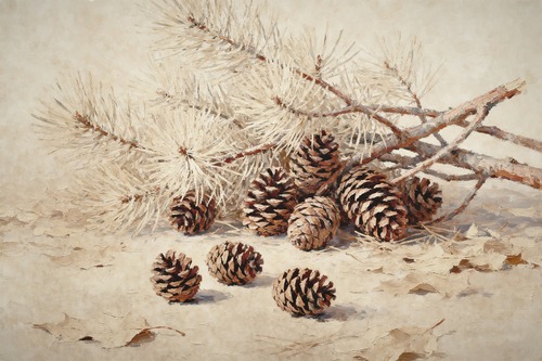Winter Pine Cones Still Life Rustic Woodland Nature Illustrations Scenic Colorful Multicolor Warm Living Room Bedroom Office
