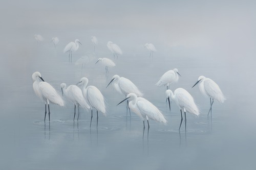 MUDECOR Premium Framed White Egrets in Blue Mist Tranquil Lake Illustrations Impressionism Scenic Colorful Living Room Bedroom Office Gold