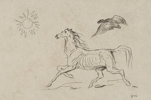 MUDECOR Framed Galloping Horse Under Sun with Bird Antique Ink Line Illustrations Fine Decorative Zen Multicolor CountryFarmhouse Retro Bedroom Natural