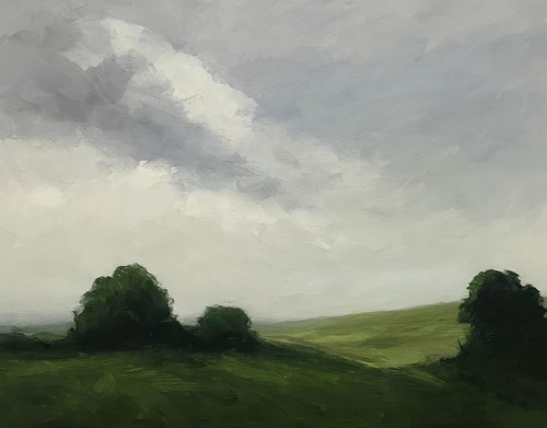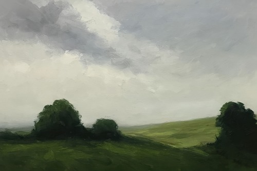 Serene Green Valley Peaceful Countryside Landscape Under Cloudy Sky Illustrations Fine Traditional Colorful Dark Living Room Bedroom Office