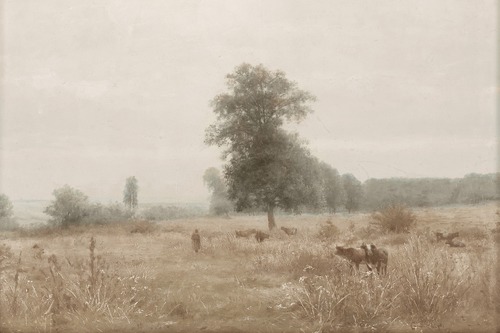 MUDECOR Framed Pasture with Cows SoftToned Countryside Scene under Overcast Sky Illustrations Minimal RelaxCalm Living Room Bedroom Office WHITE