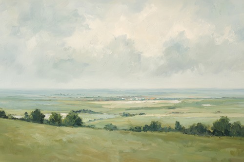 Serene Green Valley Peaceful Countryside Landscape Under Cloudy Sky Illustrations Fine Traditional Colorful Dark Living Room Bedroom Office