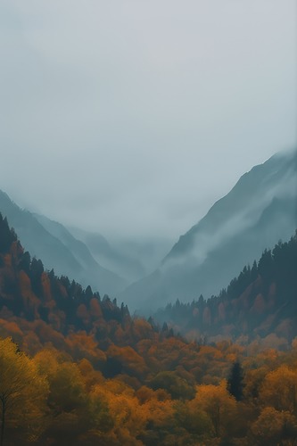 Misty Mountain Valley Serene Autumn Morning Landscape Photography Realism Decorative Elements Calm Grey Cool Black and White Living Room Bedroom Office