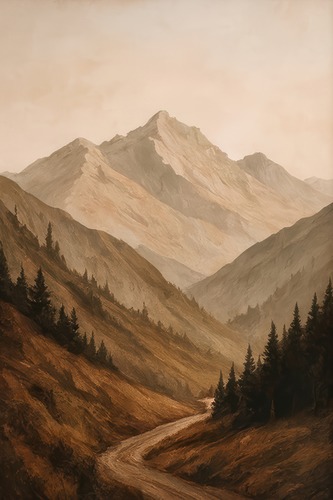 Premium Frame Sepia Mountain Valley River Vintage Landscape Illustrations Fine Traditional Iconic RelaxCalm Living Room Bedroom Office